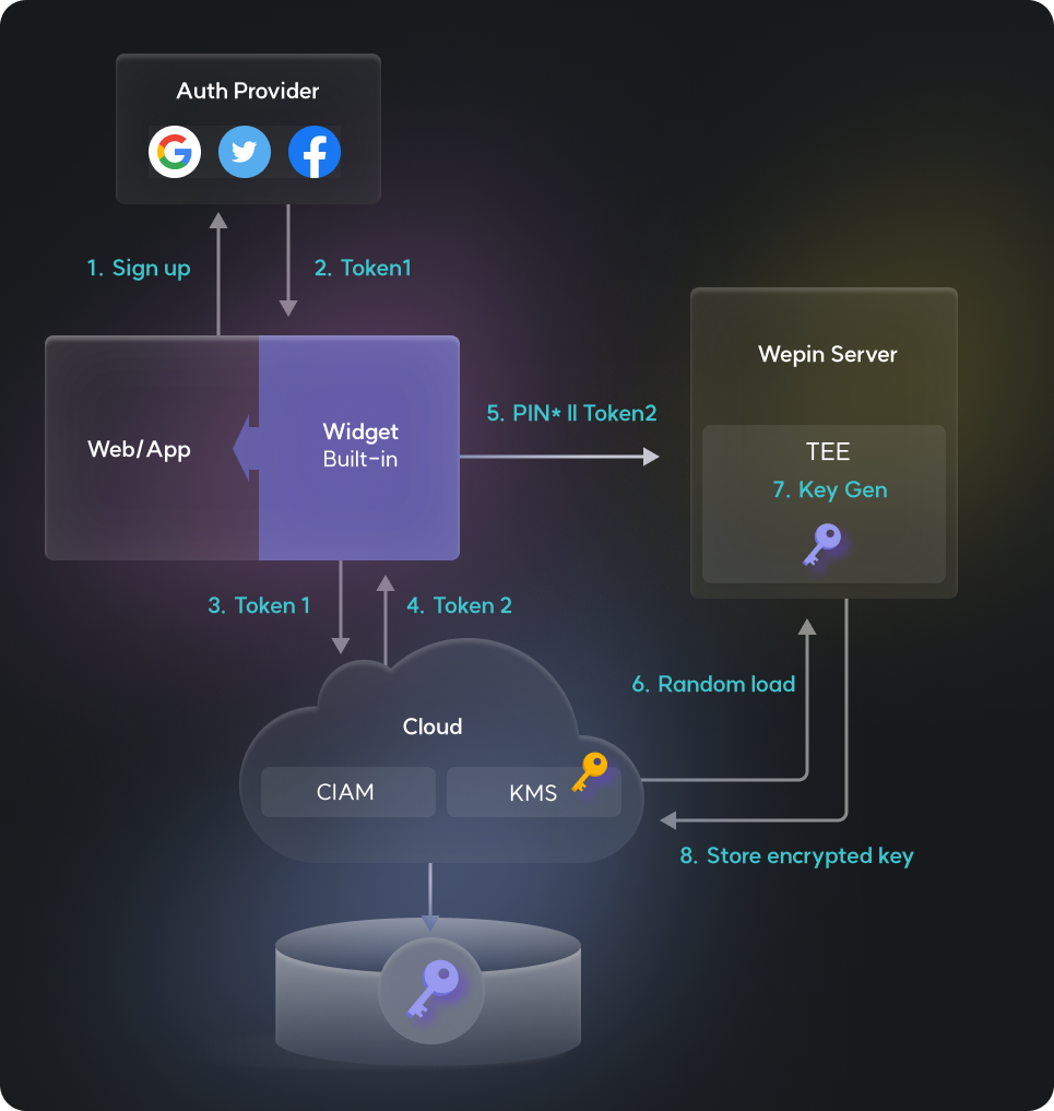 Wepin allows for the creation of wallets based on the Web2 signup and login experience through the authentication providers. After signing up through the authentication provider, a token for key management is exchanged with Amazon Web Services (AWS), and then a request for key generation is made to the Wepin server. At this point, the PIN number set is crucial information used for encrypting the private key managed in the wallet. (The PIN number is encrypted and then sent to the Wepin server, so it is not exposed.) When the Wepin server receives a request for wallet creation, it requests AWS KMS to generate a random value, and with this random value, the user's private key is generated. Since the generated private key is confidential information, it is encrypted based on the user's PIN and then securely stored in the cloud in an encrypted state.